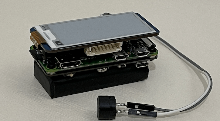 We create a small Bluetooth beacon using Raspberry Pi Zero-W, portable battery, and e-paper display. The Raspberry Pi Zero (RPIZ) is a tiny ARMv6 computer with both Wi-Fi and Bluetooth/BLE built-in. RPIZ is powered by the battery pack with programmable power-down and wake function, as well as having a button that can detect single-tap and double-tap. The button and the e-paper form the user interface (UI). A passive buzzer is added to provide audible alerts. All components can be purchased on Amazon.