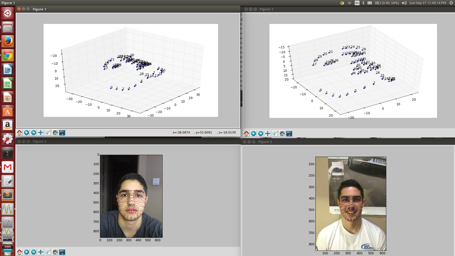 Using a “Non-rigid/deformable model” the user is able to create an exceptionally stable and smooth face tracking environment. The triangulation and connections are formatted using the 61 landmarks corresponding to an x and y coordinate that are detected. In the video below the 3D model of the facial landmarks is plotted using matplot. The plot can be shifted to view the form of the face that has been mapped. The actual landmark detection includes triangulation and connections that can be used for distance measurement and expression recognition. The pyFaceTracker includes a video based live landmarking detection system that can be used for continuous recognition. The x and y points can be streamed live as well similar to the stasm approach that has been done in recent posts. The technology behind the pyFaceTracker differs from the Active Shape Model back end of STASM as it utilizes what is known as an Active Appearance Model. The difference between the two can be noticed upon the live usage. In the active shape model which is the integral part of the STASM library,, the active shape model uses patches of the face known as landmarks that are independent of each other to find the individual coordinates. The active appearance model on the other hand creates a full texture map which the landmarks tend to morph into as a whole. Thus, the user can notice the edges of the face actually deforming to fit and model the users face. On the other hand, the user can notice that STASM has a more rigid definition in the live landmarking program that lacks the ability to dynamically alter the landmarks in certain positions. Nevertheless, even the pyFaceTracker falls short for task such as frowning for the “sad” expression, and STASM’s lack of an AAM backend should not undermine the power and robust nature of the program to detect facial landmarks at a relatively efficient pace.