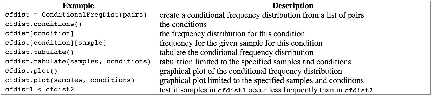 Conditional frequency distribution is good for comparing the frequency distribution between two different genres.