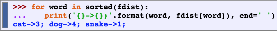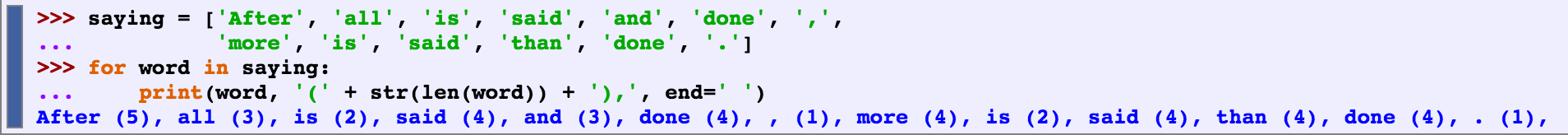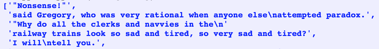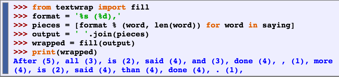 When the output of our program is text-like, instead of tabular, it will usually be necessary to wrap it so that it can be displayed conveniently. Consider the following output, which overflows its line, and which uses a complicated print statement.