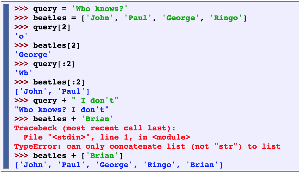 Strings and lists are both kinds of sequence. We can pull them apart by indexing and slicing them, and we can join them together by concatenating them. However, we cannot join strings and lists (we cannot technically join then, however we can change strings to lists or lists to strings using the join and split functions). Elements in a list can be altered, whereas strings cannot.